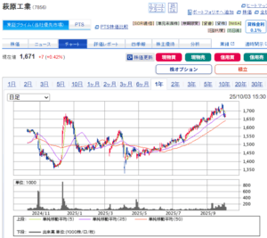 2025年10月5日現在、株価は1,671円と約17%上昇。